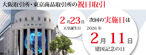 大阪取引所(OSE)及び東京商品取引所(TOCOM)においては、 祝日中のヘッジ取引機会提供による投資者の利便性の更なる向上及びそれを通じた我が国デリバティブ市場の競争力を図る観点から、 2022年9月よりデリバティブ市場における祝日取引が開始されております。 2026年における祝日取引の実施日は、以下の通りとなります。