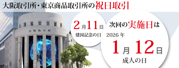 大阪取引所(OSE)及び東京商品取引所(TOCOM)においては、 祝日中のヘッジ取引機会提供による投資者の利便性の更なる向上及びそれを通じた我が国デリバティブ市場の競争力を図る観点から、 2022年9月よりデリバティブ市場における祝日取引が開始されております。 2026年における祝日取引の実施日は、以下の通りとなります。